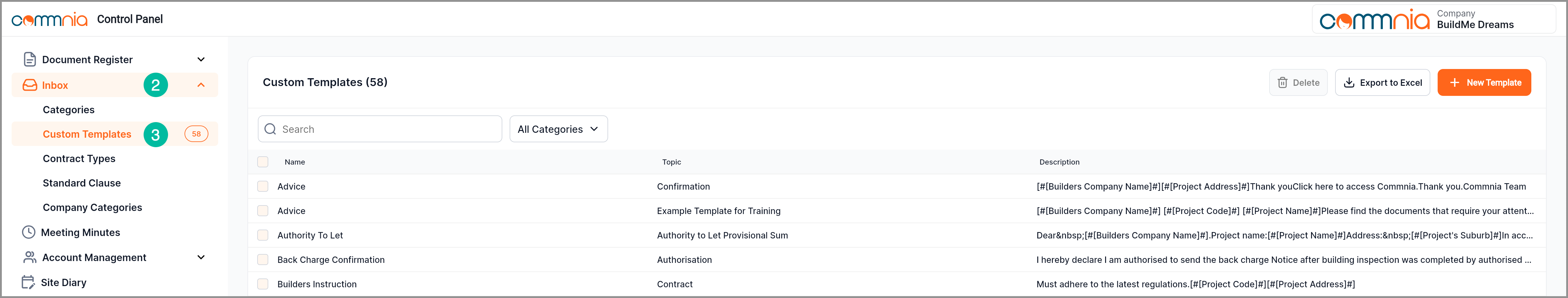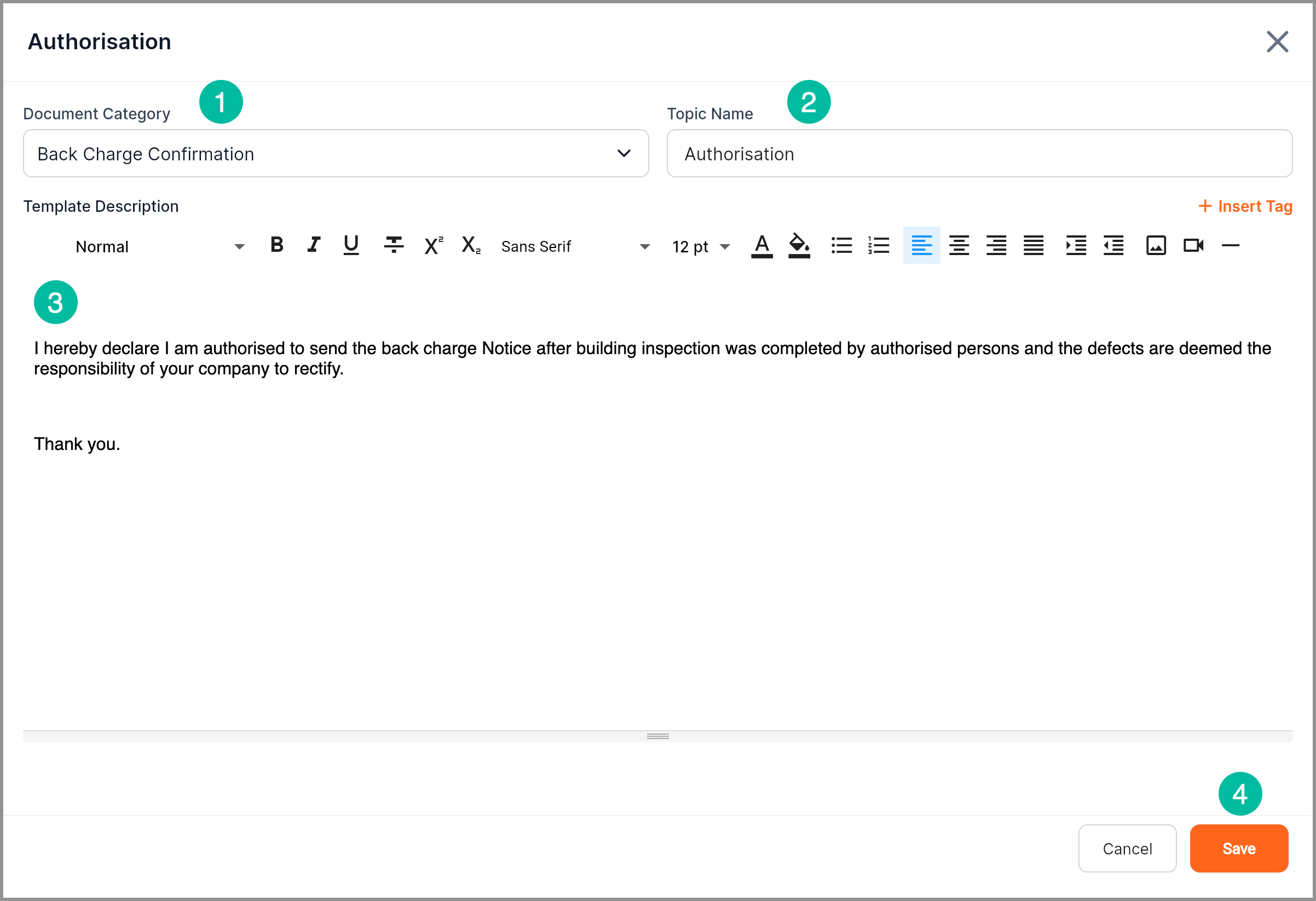 - Enter the Topic Name of the template that can be easily identified when creating emails, ie. Authorisation, latest drawings, further documentation, client acceptance etc