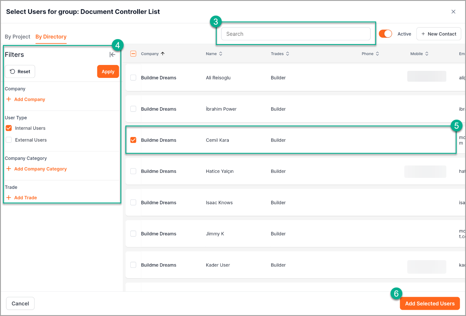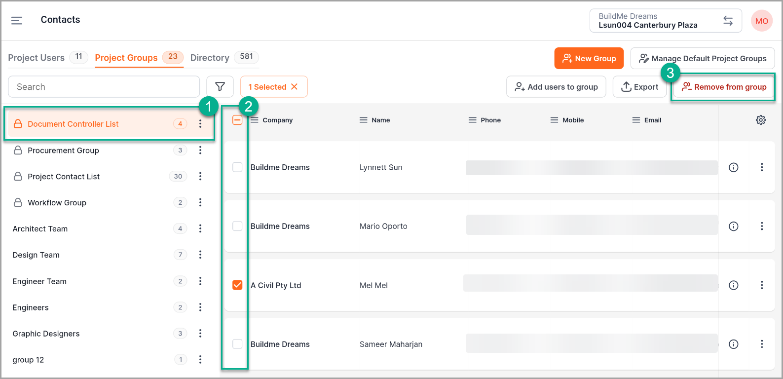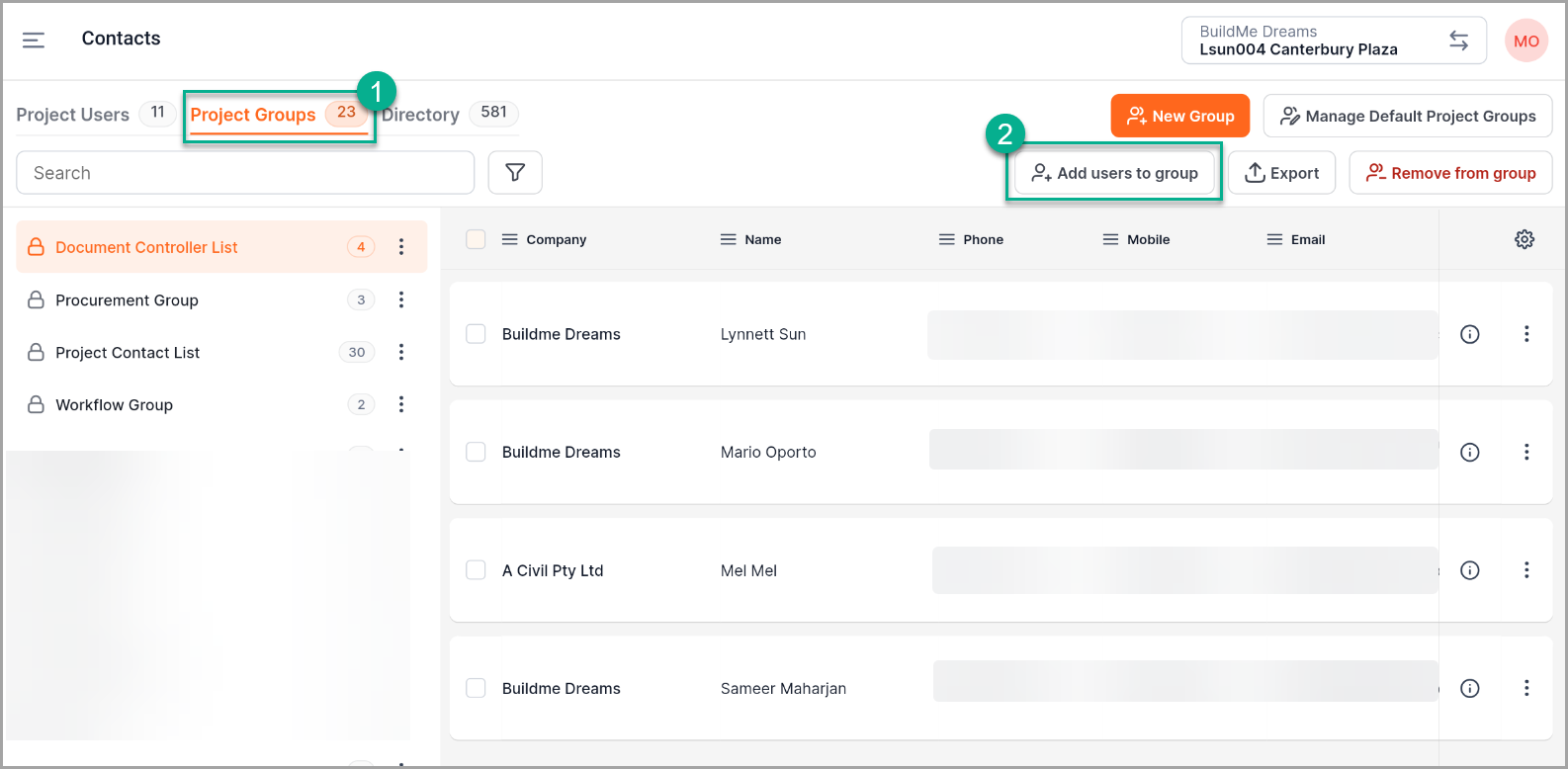 The Document Controller Group is automatically created when a new project is set up in Commnia. You can find this group inside the Contacts Module, alongside other project user groups.