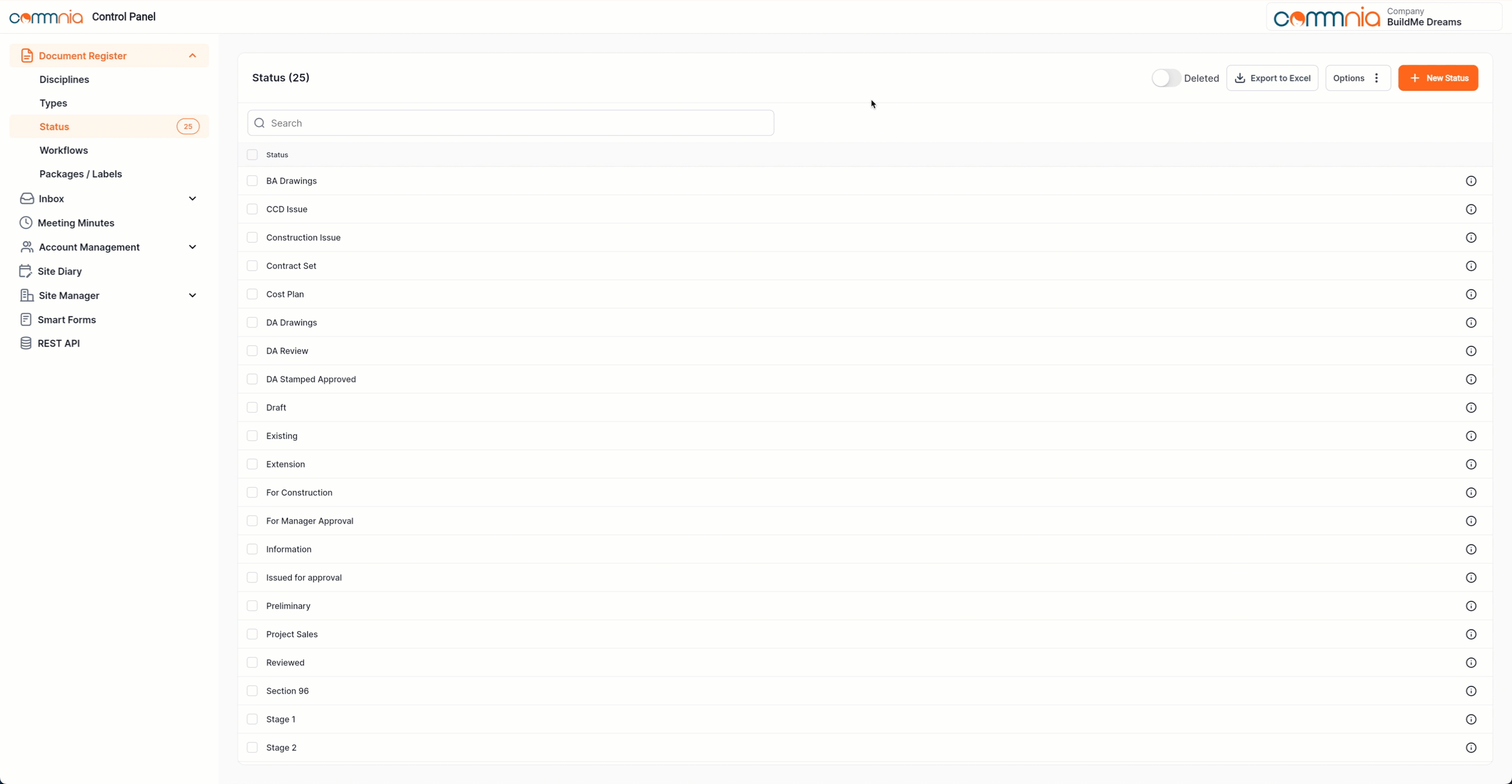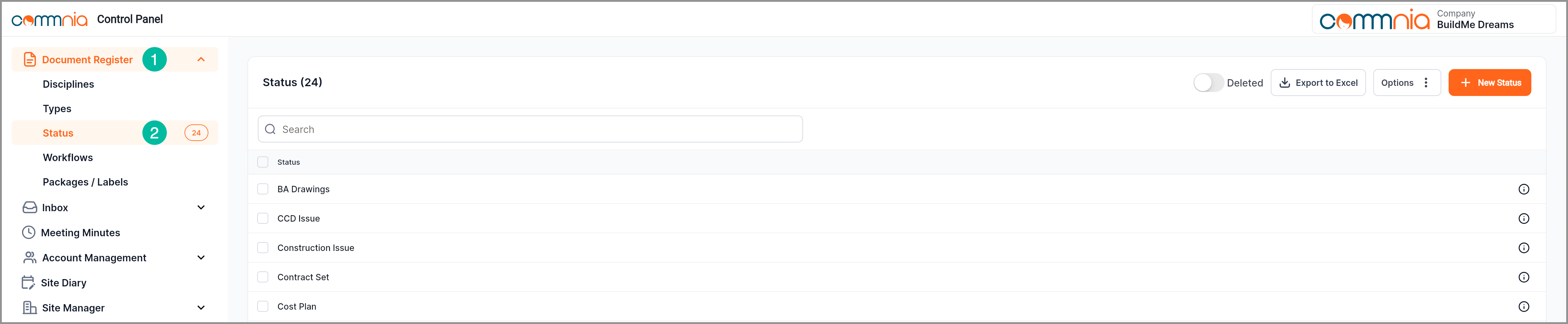 From the Document Control Panel, you can create and manage Document Status categories. These categories are used to classify and organise documents when uploading them to the Document Register.