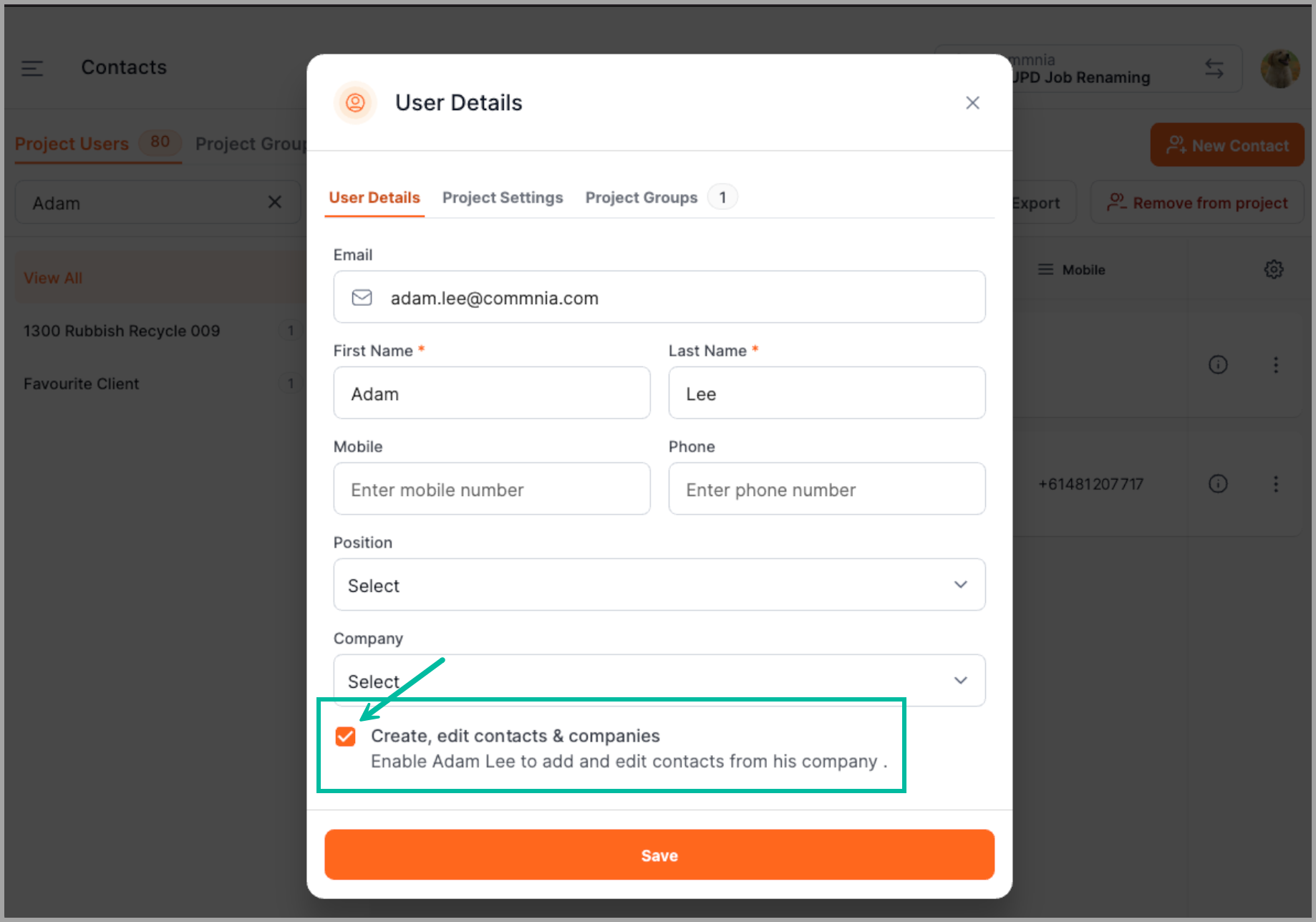 The ticked checkbox ensures the user is able to create and edit contacts within their company.