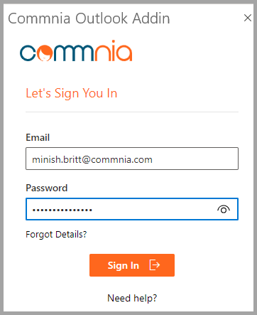 You will be prompted to enter your Commnia Login details to confirm credentials before exporting emails into Commnia.
