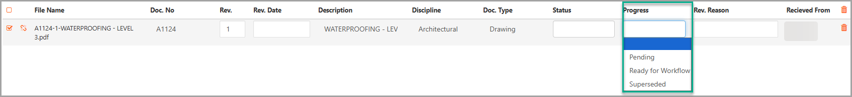 - Progress advises the document progress. Some users will only have permission to upload in a review state until an authorised user approves the document to the register. Accepted will only be available to the company controlling the Register.